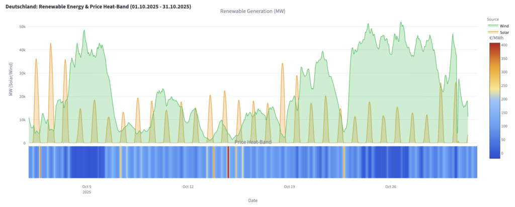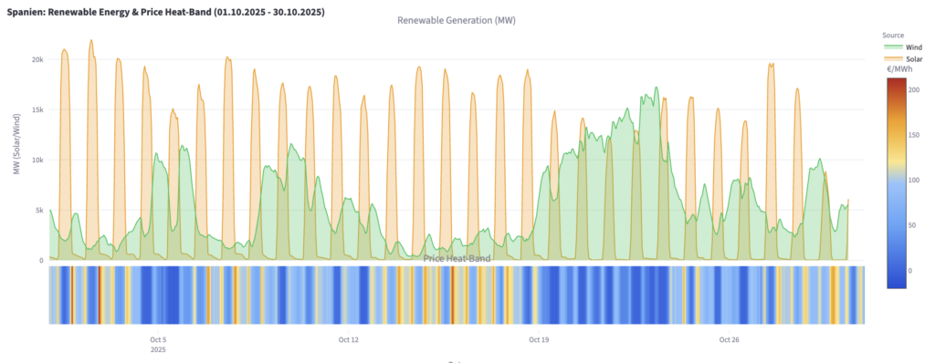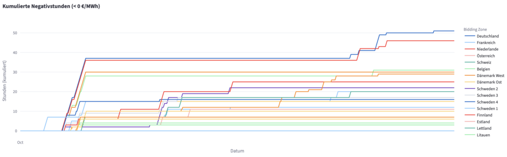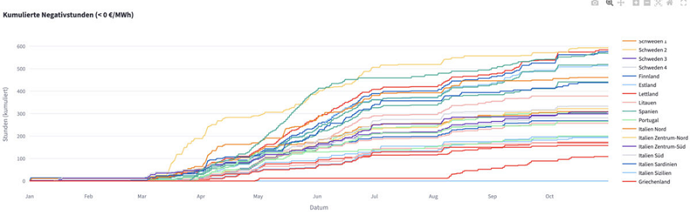 จากการวิเคราะห์ของเครื่องมือ Strommarkt-App พบว่าช่วงเวลาราคาติดลบเพิ่มขึ้นอย่างรวดเร็วทั่วทั้งทวีป เนื่องจากการผลิตพลังงานหมุนเวียนที่พุ่งสูงขึ้นและความผันผวนของสภาพอากาศที่ส่งผลกระทบต่อระบบไฟฟ้าของยุโรป ณ สิ้นเดือนตุลาคม เขตราคาที่สองของสวีเดนรายงานจำนวนชั่วโมงราคาติดลบสูงสุดที่ 593 ชั่วโมง ตามมาด้วยเนเธอร์แลนด์ (584 ชั่วโมง) เยอรมนี (576 ชั่วโมง) สเปน (569 ชั่วโมง) เบลเยียม (519 ชั่วโมง) และฝรั่งเศส (513 ชั่วโมง)